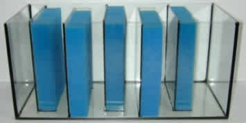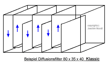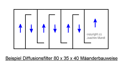 Die folgende Grafik zeigt einen Modellaufbau für einen externen Diffusionsfilter in klassischer Kammerfilterbauweise. Verwendet wird ein Standardaquarium mit den Maßen 80 x 35 x 40 cm. Jeweils rechts neben die Trennscheibe wird ein Schwamm eingelegt. Er soll eng an der Glasscheibe anliegen, die sich jeweils links von dem Schwamm befindet. Die Kammern, die bis zur Bodenscheibe reichen, benötigen jeweils einen Schwamm mit den Maßen 34 x 30 x 5 cm. Die Kammern, die bis oben reichen und unten mit einer Querscheibe versehen sind, benötigen jeweils einen Schwamm mit den Maßen 34 x 34 x 5 cm. Es werden von beiden Maßen jeweils 3 Schwämme benötigt. Als Schwamm würde ich das grobe Material empfehlen. Das effektive Volumen des Filtermaterials beträgt dabei etwa 32,5 Liter. Ausreichen würde diese Filterkammer für Aquarien mit einem Volumen von etwa 350-700 Litern. Dabei wird ein Filtervolumen von 5-10% des Beckenvolumens angenommen. Die verwendbare Aquariengröße richtet sich dabei nach dem Fischbesatz bzw. dem Stoffwechselaufkommen.